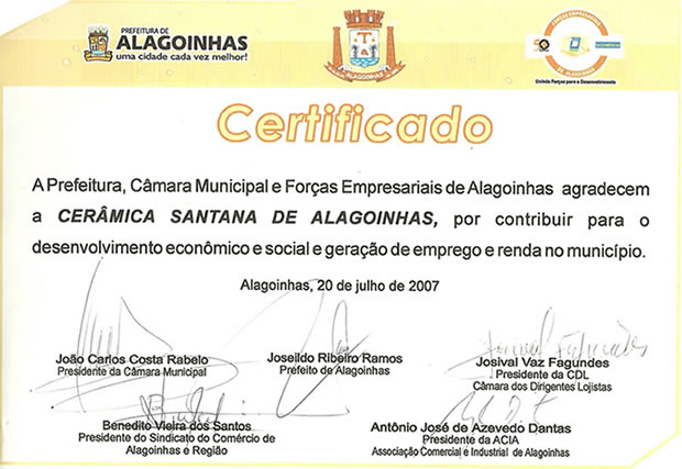 Também fomos certificados pela Prefeitura, Câmara de Vereadores e Forças Empresariais de Alagoinhas por contribuirmos para o desenvolvimento econômico e social e geração de emprego e renda no munícipio.