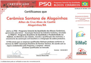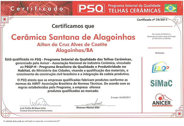 Nossa empresa preza pela qualidade no processo de industrialização dos nossos produtos. Somos a primeira indústria de cerâmica do estado da Bahia a receber o certificado do PSQ – Programa Setorial de Qualidade nas categorias Telhas e Blocos Cerâmicos.